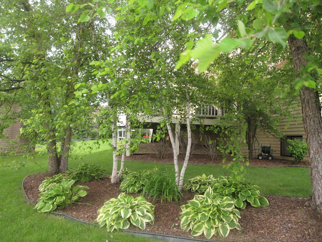 One of the things we love about our yard is the hostas. There were quite a few already planted all around the house and just in need of sprucing up so that they could bloom. After pulling and digging out the weeds and such, it was amazing to see what could transpire after only a few weeks. Because several of the back hostas were so large, we dug them up, split them in quarters and moved some to the front beds to fill in some gaps. Our neighbors are enjoying the remaining 6 from the separated hostas. :)
